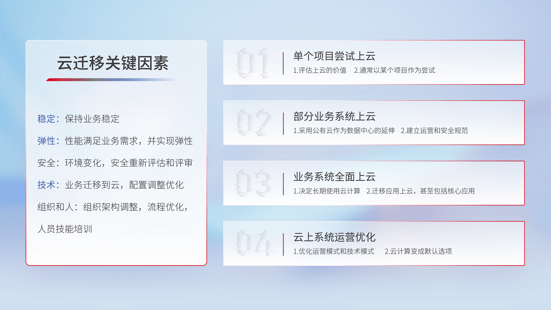 结合实际业务,,,,从规划设计、、、、云平台选型、、云原生改造、、、、数据迁移、、、、集成交付,,,迁移全过程为客户识别最佳上云路径,,做好风险识别管理,,,,设计网络架构、、、身份权限、、、、安全审计合规、、操作审计、、日志审计、、、监控告警策略、、多站点容灾设计等,,,对云上基础设施进行整体规划,,,提升IT治理水平,,以满足弹性、、高可用、、、高性能的需求。。。