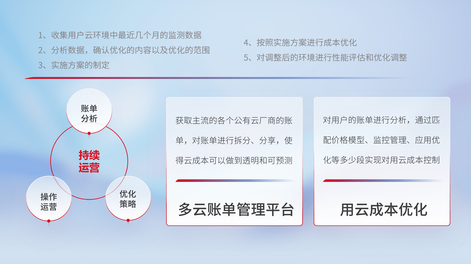 通过多云纳管,,以统一的资源数据模型把客户的云资源进行抽象和封装,,,进而实现对多云资源的统一操作,,,,保障云资源管理的可靠性、、、稳定性与可用性。。。。量身定制化运维内容,,,配置、、、开发运维、、、补丁管理、、、、备份、、、、监控、、、认证和访问管理、、、、审计和日常巡检等,,,保障在用云过程中的可靠度,,,稳定度以及高可用率。。